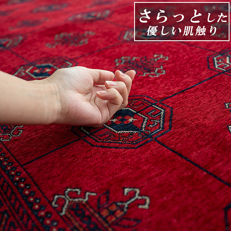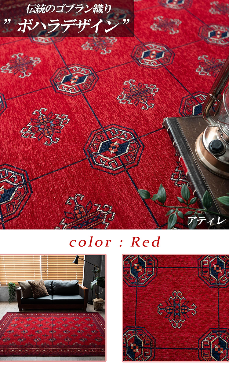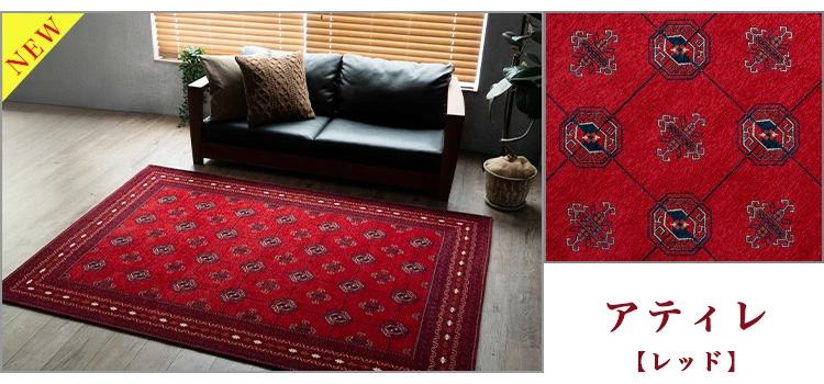 伝統あるパキスタン絨毯をモチーフ " ボハラ・デザイン " 歴史ある柄とアンティーク感を表現 日常使いにおすすめの、しっかりとした厚みと心地いい肌触り ![]() " 歴史あるボハラ・デザイン " 伝統あるパキスタン絨毯の中でも人気の高いデザインを ゴブラン織りで表現したラグ・カーペットです! ボハラ柄は、元々は中央アジアのトルクメン部族の紋章で使われる 象の足跡をモチーフにした幾何学デザインです。 "歴史あるゴブラン織り"と幾何学を組み合わせ いつものお部屋を特別な空間に演出してくれます! アティレ: レッド![]() 伝統ある美しさを受け継ぐ、新デザインが登場! 遊牧民の伝統あるデザインを配した"アティレ" 部族の紋章である八角形の幾何学デザインを 対称性高くデザインしました。 お部屋に敷くだけでアンティークな空間を演出してくれます! ![]() 伝統柄と深みのある赤は 大人かっこいいを生み出します ![]() 遊牧民の伝統ある、"ギュル文様"と、 ゴブラン織りの"さらっとした優しい触れ心地"を 組み合わせたおしゃれなラグ・カーペットを是非お楽しみ下さい。 ![]() " 触れ心地にも、こだわりました " 肌が触れる表面素材には『ポリエステル』を使用。 ポリエステルの特徴として、耐摩擦性にも優れており、 毛玉もできにくいため、長くお使いいただけます。 また、遊び毛が出にくいこともあり、お手入れのしやすい カーペットになっております。 ワンランク上の優しい触れ心地に仕上がったゴブラン織りです! ![]() " 一年を通して、お使いいただけます " ラグの厚さは、約10〜11mm (全厚)です。 毛足が短いため、ほこりやゴミなどが絡まりにくく 経糸と横糸がしっかり織り込まれているので耐久性にも優れています。 さらに床暖房やホットカーペットカバーにも対応し、 季節を問わず、1年を通してお使いいただけます。 ![]() お手入れ方法![]() ![]() おしゃれな空間を演出 "トライバル風ラグ" 上品な風合いと重厚な質感を感じる1枚 ![]() |
