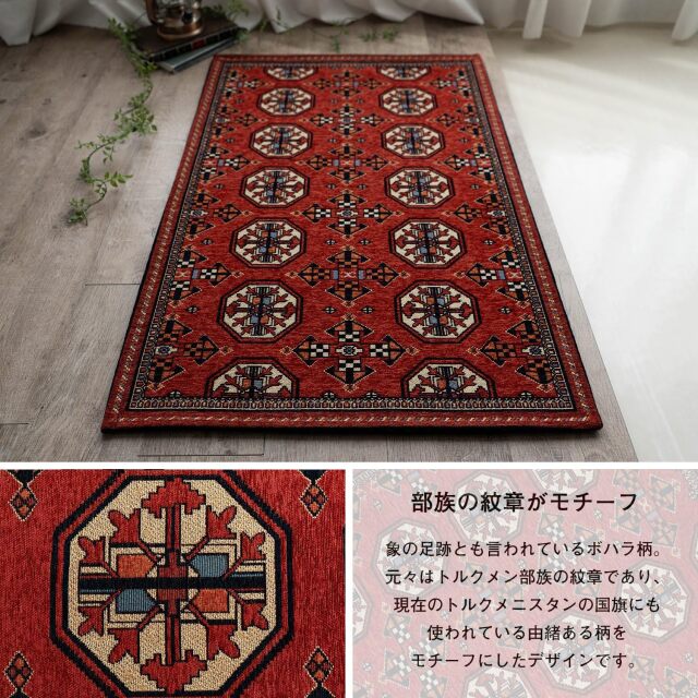 伝統あるボハラ柄を柔らかな赤色で表現、こだわり感じるゴブラン織り玄関マット。