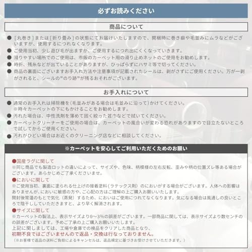 | お読みください | 【 商品について 】 ・[丸巻き]または[折り畳み]の状態にてお届けいたしますので、開梱時に巻き癖や毛並みにムラなどがございますが、使用するにつれなくなります。 ・ご使用当初、少し遊び毛が出ますが、ご使用するにつれ出にくくなっていきます。 ・滑りやすい場所でのご使用は、市販のカーペット用の滑り止めネットのご使用をお勧めします。 ・時折、残糸などが出ていることがありますが、ひっぱらずにハサミ等で切ってください。 ・商品の裏面にございますお手入れ方法や注意事項が記載されたシールは、剥がさずにご使用ください。万が一剥がされると、シールの”のり跡”が残るおそれがございます。 【 お手入れについて 】 ・通常のお手入れは掃除機を(毛並みがある場合は毛並みに沿って)かけてください。 ・※時々カーペットの下にもかけることをお勧めします。 ・汚れた場合は、中性洗剤を薄めて固く絞った雑巾などで拭いてください。 ・カーペットクリーナーをご使用の場合は、カーペットの風合いが変わる恐れがありますので目立たないところで試してからご使用ください。 ・汚れがひどい場合はお近くのクリーニング店などに相談してください。 【 輸入カーペットを安心してご利用いただくためのお願い 】 ●輸入ラグに関して ※同じ商品でも製造ロットの違いによって、サイズや、色味、柄模様の左右反転、歪みや柄の位置ズレ等ある場合がございます。あらかじめご了承くださいませ。 ●においに関して ※ご使用当初、においがする場合がございます。人体への影響はありませんが、においに敏感の方や、ご心配の方はご理解の上ご購入お願いいたします。 開封後常温のもとで気化(蒸発)するため、においはご使用につれてなくなります。気になる場合は風通しの良いところで陰干ししていただきますと、より早く解消されます。 ●サイズに関して ※カーペットの製法上、表示サイズより0~3%の誤差がございます。一部商品に関しては、表示サイズより数センチのの誤差がございます。予めご了承の上ご購入お願いいたします。 上記に関しましては、現地の工場や倉庫での検品をクリアした(海外基準を満たした)商品となり、 初期不良ではございませんので返品・交換は行なっておりません。 (※お客様で返品の送料ご負担によるキャンセルは、返品規定に基づきお受けさせていただきます。) ※カラーはディスプレイ上、実際の色と多少異なる場合がございます。 |