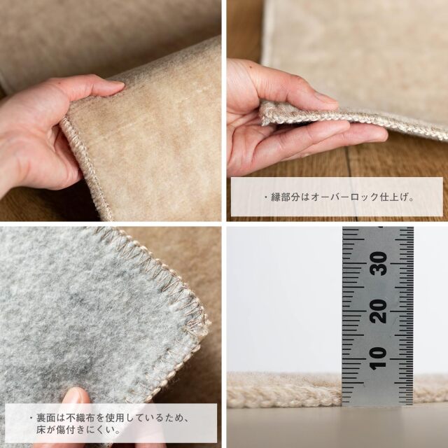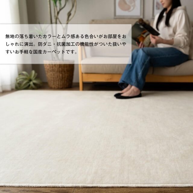 安心・安全の日本製ラグ 抗菌・防ダニ加工 お手入れ楽ちん!ペットにも優しいカットパイル! お部屋のサイズに合わせやすいフリーカットに対応! ![]() "快適なシンプルラグでお部屋を彩る" 明るい色合いから落ち着いた色合いまで 幅広いコーディネートにマッチするナチュラルカラーをご用意。 上品で洗練されたデザインは、スタイリッシュで快適な空間を創り出します。 お手入れが面倒だと思う1人暮らしの方から、リビングや ダイニング下にお手軽にお使いしたい方にオススメの、 機能性を兼ね備えた国産カーペットです! カラー:モカベージュ![]() "扱いやすさにこだわった素材" パイルには『ポリエステル』を使用。 素材のポリエステルは、遊び毛が少なく、お手入れも しやすいのが特徴です。さらに、カットパイルにすることで、 柔らかな肌触りと上品な温かみに優れた カーペットになっております。 また、お掃除のしやすさなど日常使いも考えた、 カーペットとなっております。 ![]() ![]() " 1年を通して、お使いいただけます " カーペットの厚さは、程よい厚みの約6〜7mm (全厚)です。 重さも程よい重さのため、女性の方でも お部屋の移動など、しやすい1枚となっております。 冬場には床暖房やホットカーペットカバーにもお使いいただけ、 暖かい季節には肌触りがいいカーペットです! ![]() 自由なサイズにカットお好みのサイズにカットして、お部屋に敷き詰めれるように フリーカットに対応しています。 ![]() カラー:アイボリー![]() "アイボリー"は、自然な穏やかさのある優しい色合いが魅力で お部屋全体を暖かい雰囲気に仕上げます。 ![]() ![]() ![]() " ペットにも優しい機能が魅力 "![]() このカーペットの抗菌・防ダニ加工は、刺激性もなく 食塩レベルの安全性なので、小さなお子様やペットが 口に触れても安心です。 ダニアレルギー対策にも効果があり、ご家庭で毎日使うものだからこそ 安心してお使いただけます。 またパイルの毛先をカットし、ループになっていないので ペットの爪もひっかかりにくく走っても滑りにくい カーペットになっています。 カラー:スノーホワイト![]() スタイリッシュな印象を与える"スノーホワイト" 清潔感があり、お部屋がすっきりと見えるため 幅広く好まれやすいインテリアスタイルです。 ![]() ![]() "あなたの暮らしを豊かにする 機能性&デザイン" ![]() お手入れ方法![]() カラー:スカイグレー![]() 洗練された大人な雰囲気の"スカイグレー" 少し青みがかった色合いが 飽きのこないおしゃれなテイストのラグです。 ![]() ![]() ![]() 選べる4色展開インテリアに合わせてお選びください。 ![]() 日本製の抗菌・防ダニ加工 お部屋のサイズに合わせて、フリーカットにも対応した カーペットでインテリアを簡単コーデしてみませんか?