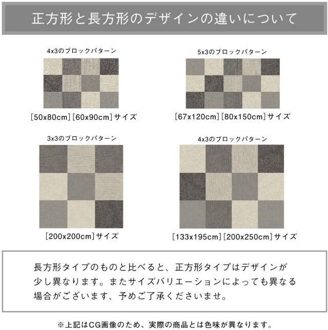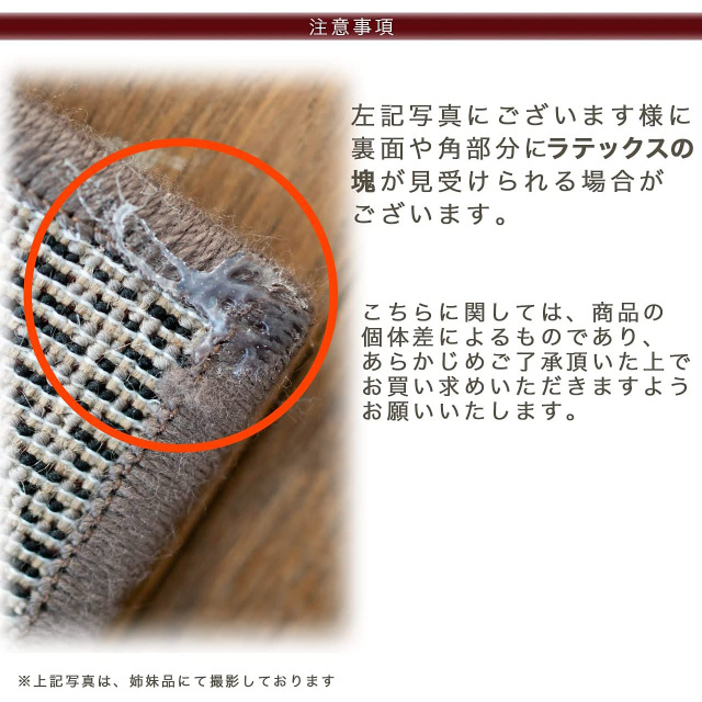 | お読みください | 【 商品について 】 ・[丸巻き]の状態でお届けいたします。開梱時に巻き癖(折り癖)や毛並みにムラなどがございますが、使用するにつれなくなります。 ・ご使用当初、少し遊び毛が出ますが、ご使用するにつれ出にくくなっていきます。 ・滑りやすい場所でのご使用は、市販のカーペット用の滑り止めネットのご使用をお勧めします。 ・時折、残糸などが出ていることがありますが、ひっぱらずにハサミ等で切ってください。 ・商品の裏面にございますお手入れ方法や注意事項が記載されたシールは、剥がさずにご使用ください。万が一剥がされると、シールの”のり跡”が残るおそれがございます。 【 お手入れについて 】 ・通常のお手入れは掃除機を(毛並みがある場合は毛並みに沿って)かけてください。 ※時々カーペットの下にもかけることをお勧めします。 ・汚れた場合は、中性洗剤を薄めて固く絞った雑巾などで拭いてください。 ・カーペットクリーナーをご使用の場合は、カーペットの風合いが変わる恐れがありますので目立たないところで試してからご使用ください。 ・汚れがひどい場合はお近くのクリーニング店などに相談してください。 【 輸入カーペットを安心してご利用いただくためのお願い 】 下記に関しましては、商品の初期不良ではございませんので返品・交換は行なっておりません。 (※お客様で返品の送料ご負担によるキャンセルは、返品規定に基づきお受けさせていただきます。) ・ご使用当初、裏面に塗られる仕上げの接着塗料(ラテックス剤)のにおいがする場合がございます。 人体への影響はありませんが、においに敏感の方や、ご心配の方はご理解の上ご購入お願いいたします。 開封後常温のもとで気化(蒸発)するため、においはご使用につれてなくなります。気になる場合は風通しの良いところで陰干ししていただきますと、より早く解消されます。 ・カーペットの製法上、表示サイズより0~2%の誤差がございます。 ※カラーはディスプレイ上、実際の色と多少異なる場合がございます。 |
