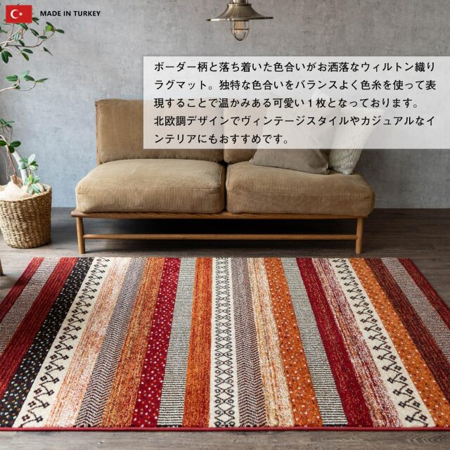 優しく温かみのある色使い、エスニック調の雰囲気がおしゃれなボーダーデザインのウィルトン織りマットです。