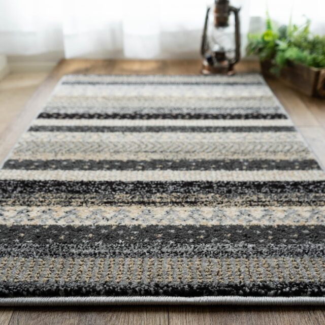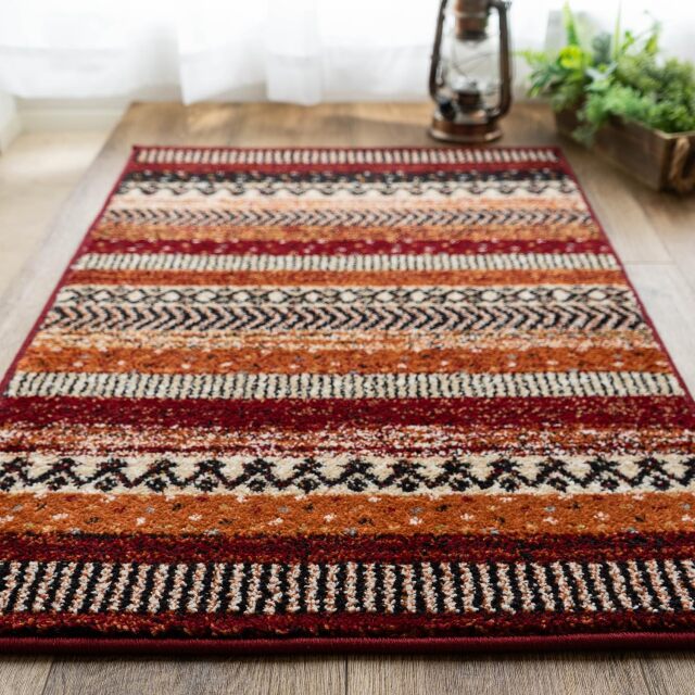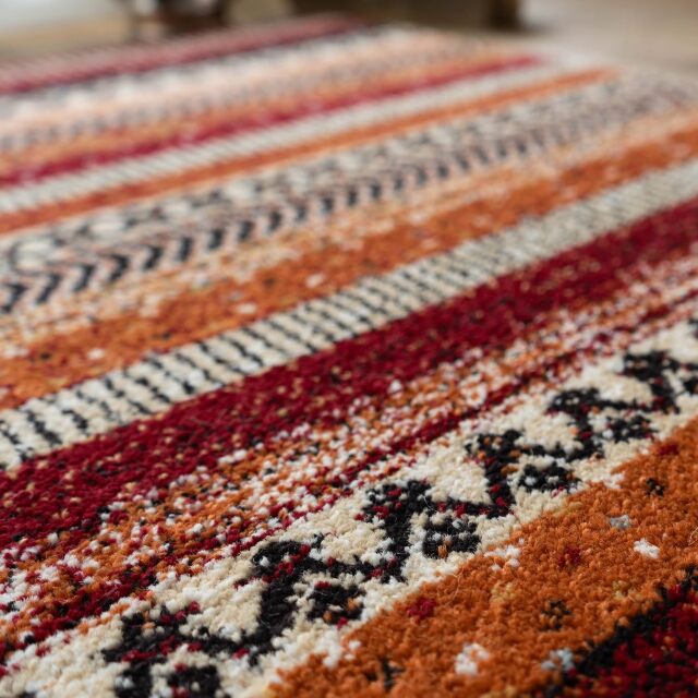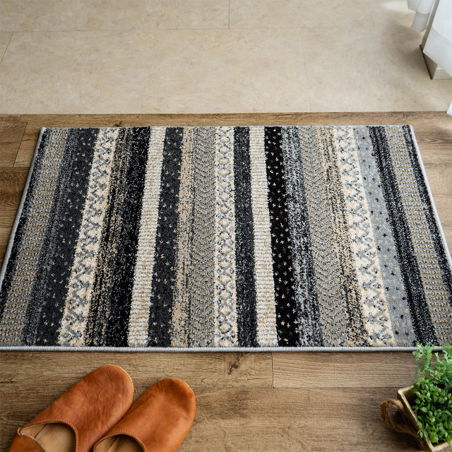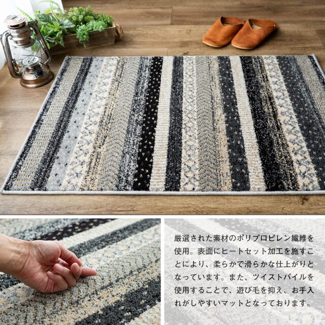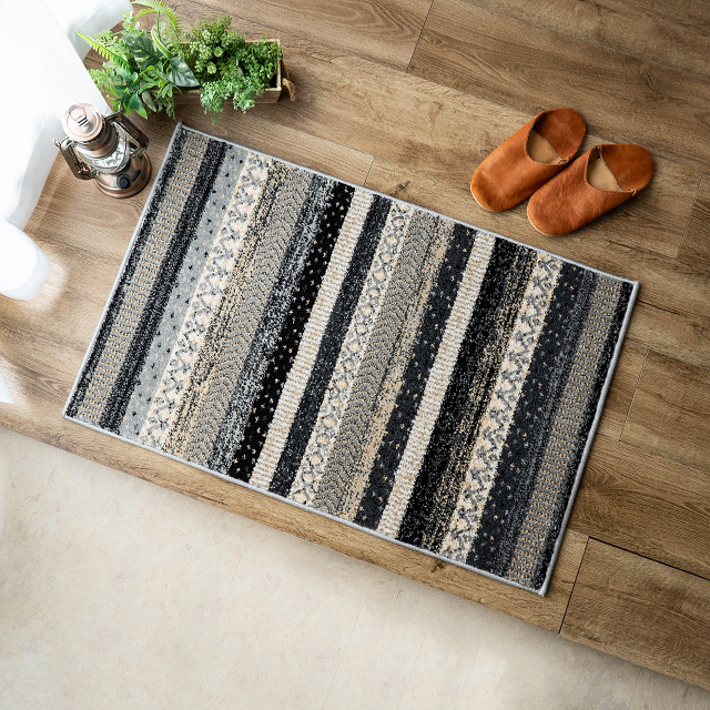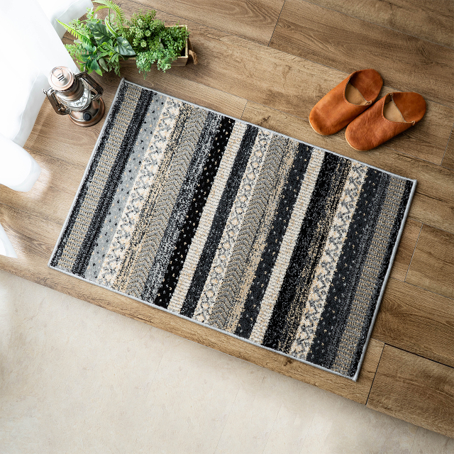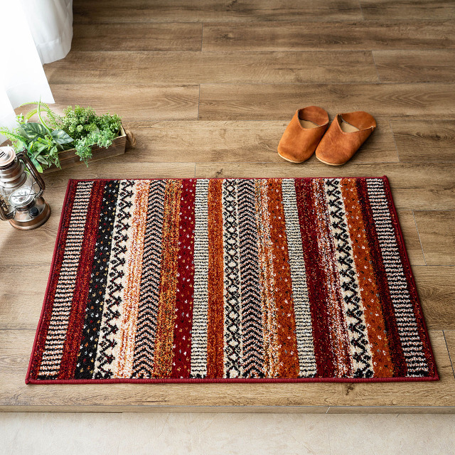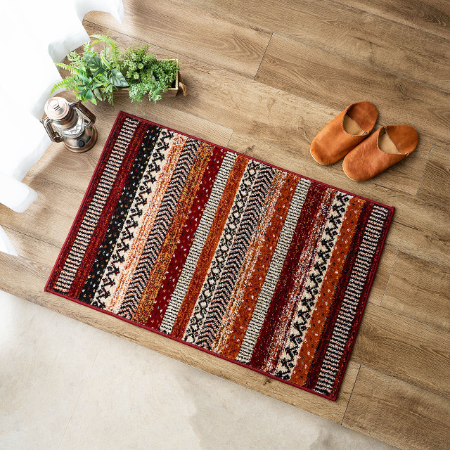 優しく温かみのある色使い、エスニック調の雰囲気がおしゃれなボーダーデザインのウィルトン織りマットです。