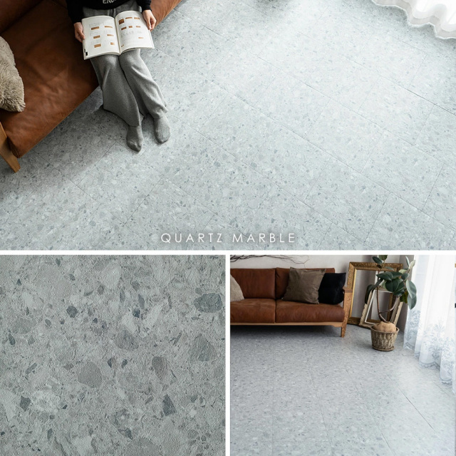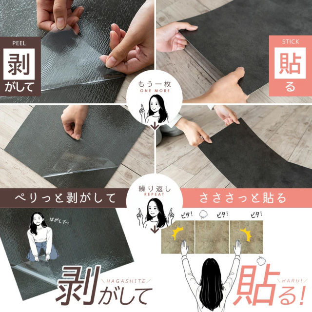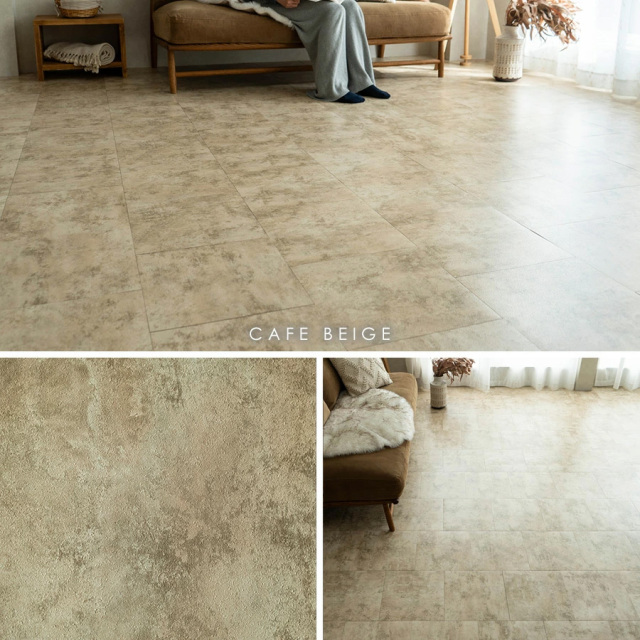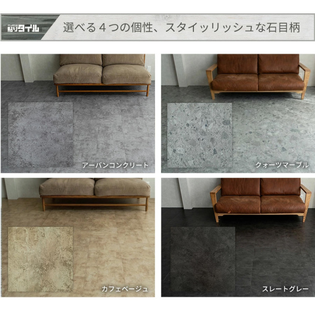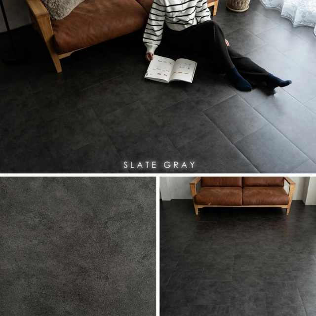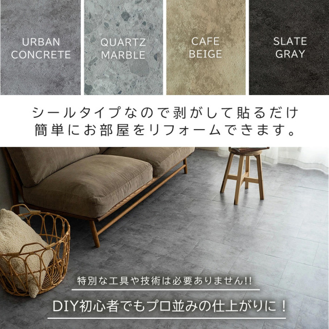 定番で使いやすい"ストーンデザイン"をご用意しました。 当店でお取り扱いするフロアタイルは剥がして貼るだけの簡単施工! 接着剤不要で、お好きなサイズにカッターで簡単に切れます。 "貼りタイル"ならDIY初心者でも手軽に本格的な床リフォームが可能です。
