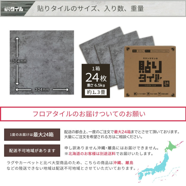 | サイズ | 1枚あたりのサイズ304 X 304mm 3箱72枚/ 約4.1帖 |