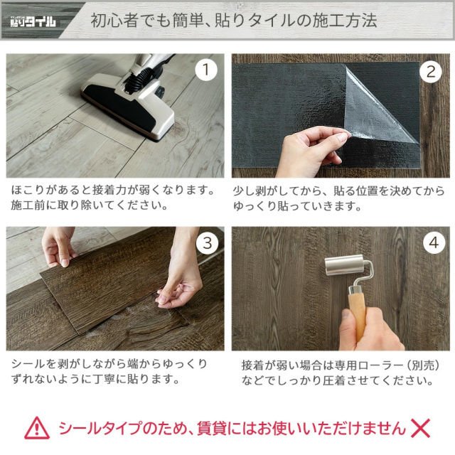 【商品について】 ・賃貸物件など、原状回復が必要な床への「直貼り」は推奨しておりません(養生テープ等を下地に貼ってからの施工をご検討ください) ・床にほこり・砂などがあると接着力が弱くなり、表面に浮き出たり、段差ができたりする原因となりますので 施工前に取り除いてください。 ・接着が弱い場合は専用ローラー(別売) などでしっかり圧着させてください。 ・1箱が約10kgと重量がありますので取扱いには十分ご注意ください。 ・畳みなど、沈み込む柔らかい床面上ではご使用いただけません。 ・床暖房や高熱になる場所ではご使用いただけません。 ・こちらのフロアタイルは素材の特性上、温度や湿度の変化により約0.1%程伸縮します。 室温を22~24度に保って馴染ませてから施工してください。 ・突き上げ(床が盛り上がる現象)を防ぐため、壁際などはわずかに隙間を空けて貼ることを推奨します。 ・水場などでのご使用時、タイルどうしの隙間から水・湿気が入り込み床面をいためる恐れがあります。 ・生産ロットによりわずかな色、サイズ差がでる場合があります、後日追加購入される場合にはご了承の上ご購入ください。 ・使用後のクレームは一切受け付けておりません、事前に確認の上、ご使用ください。 ・一度のご注文は最大288枚までとさせて頂いております。大量購入をご検討の方は店舗スタッフまでご相談ください。 ・重量品のため、配達状況により1階玄関先、もしくはトラックが停車できる場所での受け渡しになる場合があります。 ・新築・内装現場などは受け渡し場所・相手がわかりにくいため配送不可とさせて頂いております。ご希望の方は店舗スタッフまでご相談下さい。 ・ラグやカーペットと比べ重量品のため、北海道、沖縄、離島など陸送できない地域は配送不可とさせて頂いております。 ※カラーはディスプレイ上、実際の色と多少異なる場合がございます。 ※商品によりサイズに多少の誤差があります。 |