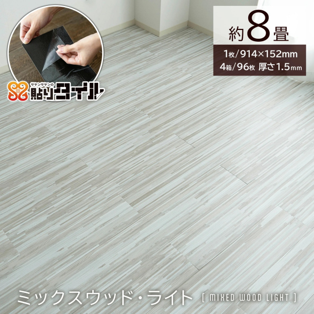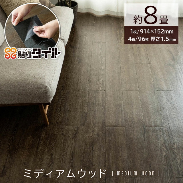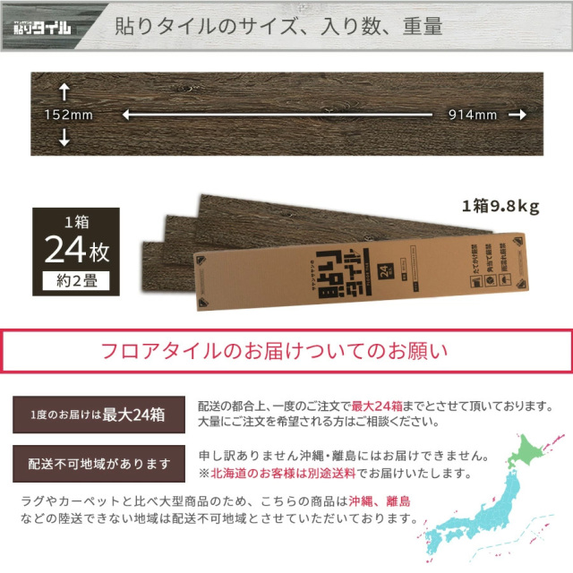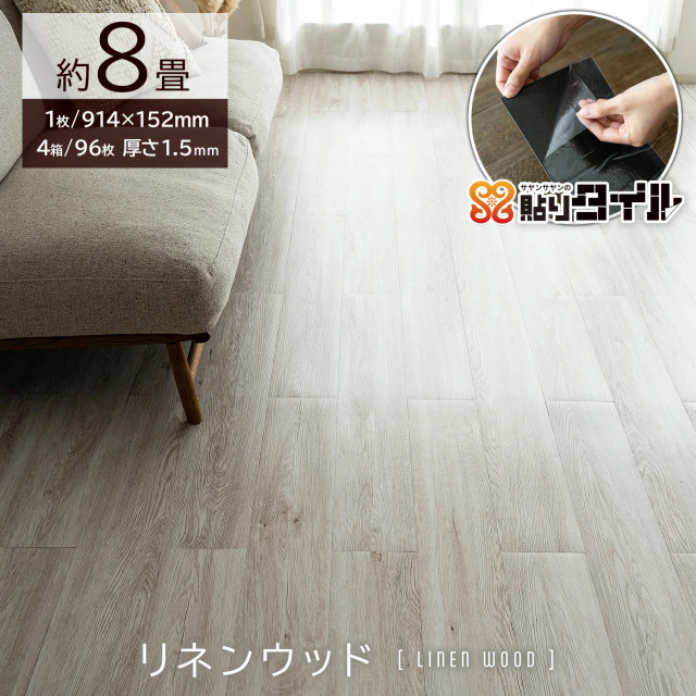 | サイズ | 1枚あたりのサイズ914x152mm 4箱96枚/ 約8帖 |