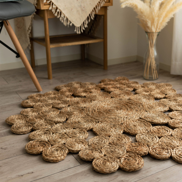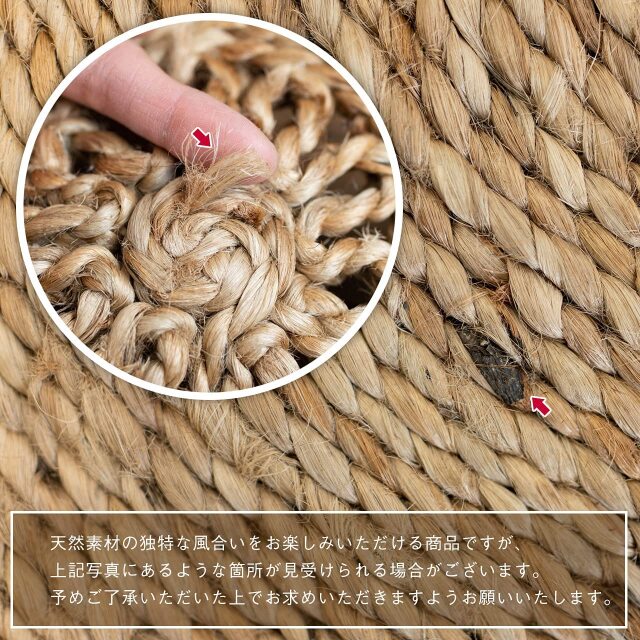 素足に心地いい、天然の素材感 "ナチュラル・ジュートラグ" 天然のジュート(麻)100%を使用したおしゃれデザイン 卸通販価格! 安心の税込プライス ![]() " ナチュラルな雰囲気がおしゃれ" 天然素材のジュート(麻)を、専門の職人さんにより ハンドメイドで丁寧に作られたジュートラグです。 シンプルで、素朴な雰囲気のラグですが、お部屋に1枚敷くと 存在感があり天然素材ならではの独特な雰囲気が インテリアをおしゃれに飾ります。 また、当店で取り扱いのジュートラグは、90cmの円形サイズで、 この絶妙なサイズ感が、敷く場所を選ばずどこにでも敷ける ちょどいい大きさの1枚となっています。 デザイン: デイジー![]() " 通気性に優れたジュート素材 " 素材には、厳選された"天然のジュート"を使用 (麻 100%) 麻素材と聞くと、チクチクしたイメージがありますが、 当店の麻素材は、比較的ソフトな触れ心地で、 肌に触れても優しい素材となっております。 さらに、通気性、耐久性、保温性、放湿性にも優れた素材です。 そのため夏場だけでなく、寒い冬場にも保温性にも 優れていることから床暖房の上に敷いてお使いいただけます。 リビングのチェア下や玄関、ベッドサイドなどお好きな 場所に敷いていただき、お気に入りの空間を演出いたします! ![]() ![]() " 日常使いしやすい、ジュートラグです " 厚さ、約12〜13mm (全厚)の程よい厚みのラグです。 程よい厚みと、重たすぎない重さのため、 模様替えの際のお部屋の移動や、収納などもしやすいです。 ![]() 手織りで織られた"温もり"伝わる ジュートラグ デザイン: ロータス![]() " 手織りならではのクラフト感 " ナチュラルな素材感が特徴のジュートですが、 そこにホワイトに色染めしたジュートを組み合わせたのが、 こちらのロータスになります。 不均一な素材感あるジュートの色合いに、ホワイトを組み合わせることで、 単色とは違ったおしゃれな雰囲気と、手織りならではの温かみを 表現したラグに仕上げました。 ![]() ![]() ホワイトの色合いが、お部屋のアクセントに! ![]() お手入れ方法![]() 必ずお読みください![]() デザイン: リリー![]() " 小さなサークルの、愛らしいフォルム " 1つ1つの小さなサークルを組み合わせた特徴あるデザイン。 1つ1つの小さなサークルは、サイズが不均一ですが、 その小さなサークルを組み合わせることで、1枚のラグに作り上げた時に 独特な愛らしいフォルムを表現しています。 ![]() ![]() 通気性よく、足元から快適な心地よさ! ![]() 選べる3デザインインテリアよって選べる3デザイン展開 ![]() " 手織りならではのクラフト感 " 天然の麻を使用した"素足の心地よさ"と ナチュラルで優しい雰囲気の"おしゃれなデザイン"を 組み合わせたジュートラグで、インテリアをおしゃれに飾りませんか?