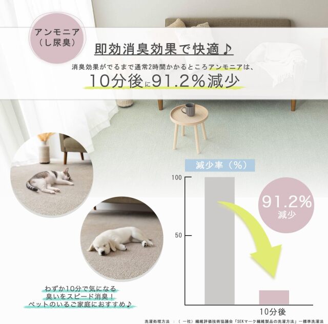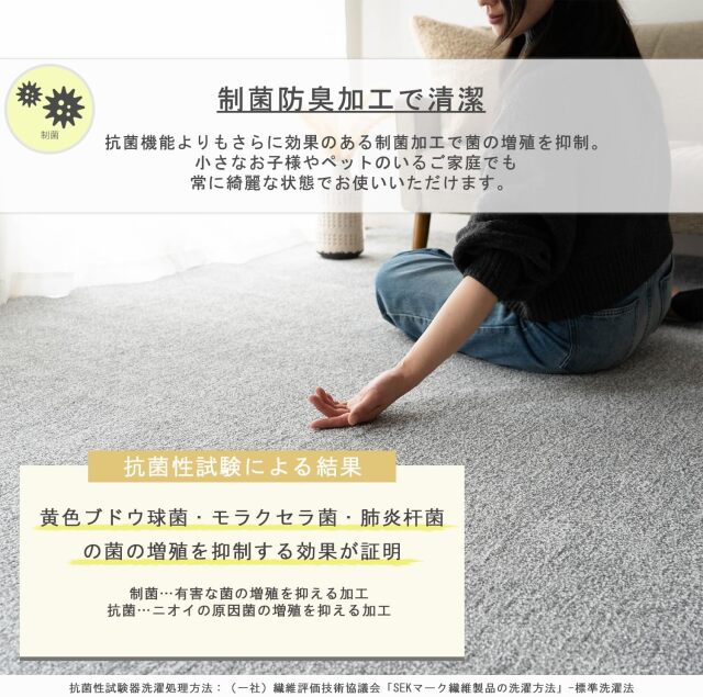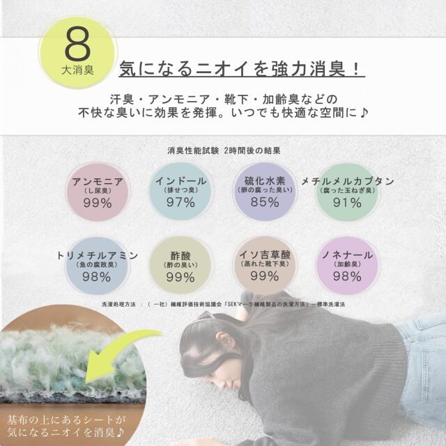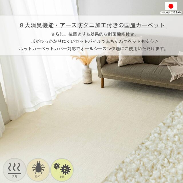 8大消臭機能付きで臭いを元から強力消臭。アース防ダニ・制菌防臭加工の付いた高機能性国産カーペット。