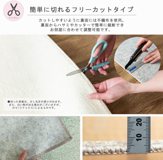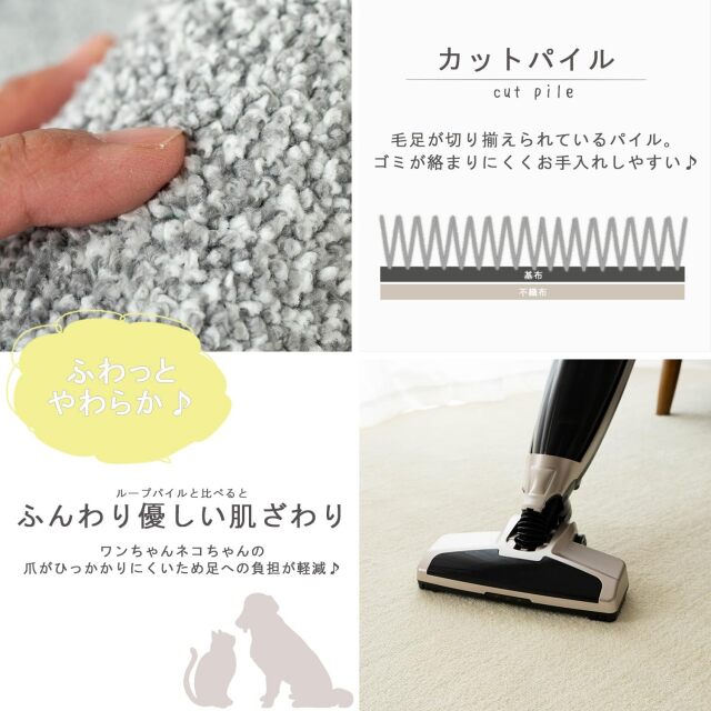 安心の日本製カーペット 8大消臭・制菌・防臭・防ダニ加工 "お手入れ楽ちん!ペットにも優しいカットパイル" お部屋のサイズに合わせやすいフリーカットに対応! ![]() "快適なシンプルラグでお部屋を彩る" 落ち着いたカラーと上品な質感で、 幅広いコーディネートにマッチするナチュラルカラー4色をご用意。 上品で洗練されたデザインは、スタイリッシュで快適な空間を創り出します。 お手入れが面倒だと思う1人暮らしの方から、リビングや ダイニング下にお手軽にお使いしたい方にオススメの、 機能性を兼ね備えた国産カーペットです! カラー:アイボリー![]() " 扱いやすさにこだわった素材 " パイルには『ポリエステル』を使用。 (ポリエステル100%) マイクロファイバーのポリエステルを使用しており、 柔らかなタッチが特徴的です。 さらに、カットパイルにすることで、 ペットの爪もひっかかりにくく、走っても滑りにくい カーペットになっております。 また、お掃除のしやすさなど日常使いも考えた、一枚になっております。 カラー:ベージュ![]() 気になるニオイを元から分解 " 8大消臭機能付きラグ " 一般的な消臭カーペットは、3大〜5大消臭に対応しているものが多いですが、 こちらのカーペットは、8つの消臭機能に対応していますので より広範囲な生活臭を軽減し、空間を清潔で快適に保ちます。 ![]() 自由なサイズにカットお好みのサイズにカットして、お部屋に敷き詰めれるように フリーカットに対応しています。 ![]() カラー:グレー![]() ダニを寄せ付けない、" アース防ダニ加工 " アース製薬の技術による防ダニ加工は、 ダニを寄せ付けにくく、目に見えない不安から暮らしを守ります。 人体には無害なので、赤ちゃんやペットのいるご家庭にも 安心してお使いいただけます! ![]() カラー:グリーン![]() " 1年を通して、お使いいただけます " カーペットの厚さは、約7〜8mm (全厚)です。 冬場には床暖房やホットカーペットカバーにも対応し、 お手頃価格で、1年を通してお使いいただけカーペットです! お手入れ方法![]() 選べる4色展開インテリアに合わせてお選びください。 ![]() 安心・安全の日本製ラグ 8大消臭・制菌・防臭・防ダニに対応 お部屋のサイズに合わせて、フリーカットにも対応した カーペットでインテリアを簡単コーデしてみませんか?
