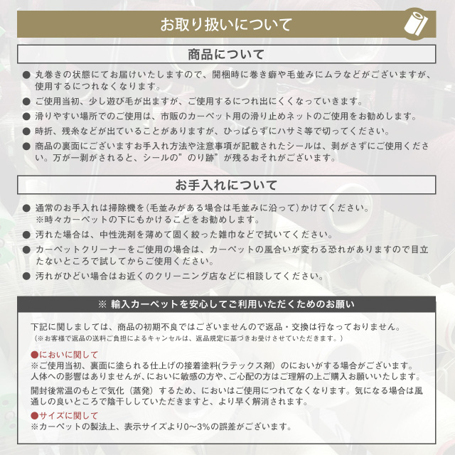 | お読みください | 【 商品について 】 ・[丸巻き]の状態でお届けいたします。 ・ご使用当初、少し遊び毛が出ますが、ご使用するにつれ出にくくなっていきます。 ・滑りやすい場所でのご使用は、市販のカーペット用の滑り止めネットのご使用をお勧めします。 ・時折、残糸などが出ていることがありますが、ひっぱらずにハサミ等で切ってください。 ・商品の裏面にございますお手入れ方法や注意事項が記載されたシールは、剥がさずにご使用ください。万が一剥がされると、シールの”のり跡”が残るおそれがございます。 【 お手入れについて 】 ・通常のお手入れは掃除機を(毛並みがある場合は毛並みに沿って)かけてください。 ※時々カーペットの下にもかけることをお勧めします。 ・汚れた場合は、中性洗剤を薄めて固く絞った雑巾などで拭いてください。 ・カーペットクリーナーをご使用の場合は、カーペットの風合いが変わる恐れがありますので目立たないところで試してからご使用ください。 ・汚れがひどい場合はお近くのクリーニング店などに相談してください。 【 輸入カーペットを安心してご利用いただくためのお願い 】 下記に関しましては、商品の初期不良ではございませんので返品・交換は行なっておりません。 (※お客様で返品の送料ご負担によるキャンセルは、返品規定に基づきお受けさせていただきます。) ・ 同じ商品でも製造ロットの違いによって、サイズや、色味、柄模様の左右が反転していたり、位置がズレている場合がございます。 ただし、現地の工場や倉庫での検品をクリアした商品を輸入しています。あらかじめご了承くださいませ。 ・においに関して ※ご使用当初、裏面に塗られる仕上げの接着塗料(ラテックス剤)のにおいがする場合がございます。 人体への影響はありませんが、においに敏感の方や、ご心配の方はご理解の上ご購入お願いいたします。 開封後常温のもとで気化(蒸発)するため、においはご使用につれてなくなります。気になる場合は風通しの良いところで陰干ししていただきますと、より早く解消されます。 ・カーペットの製法上、表示サイズより0~3%の誤差がございます。 ・裏面の製品シールは剥がさないでご使用ください。。 ※カラーはディスプレイ上、実際の色と多少異なる場合がございます。 |