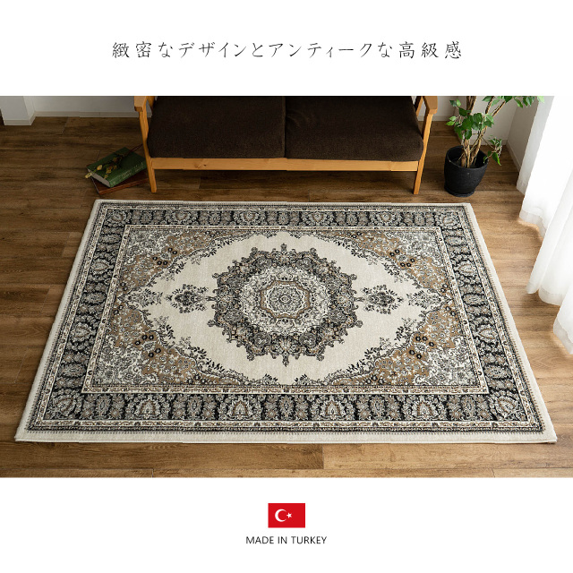 ペルシャ絨毯のような豪華さ、伝統あるペルシャデザインを高級感ある色使いと、75万ノットのウィルトン織りで緻密に表現したカーペットです。豪華なクラシック柄がお部屋をより上質に演出してくれます。クリーム・ブルー・チャコールブラウンはかすれた雰囲気が魅力のヴィンテージスタイルに、レッド・ブラックはアンティーク調の上品なベーシックスタイルにおすすめです。