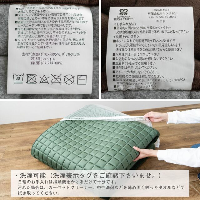 | お読みください | 【 商品について 】 ・折りたたみ又は圧縮梱包にてお届けいたしますので、開梱時に折り癖や毛並みにムラなどがございますが、使用するにつれなくなります。 ・ご使用当初、少し遊び毛が出ますが、ご使用するにつれ出にくくなっていきます。 ・滑りやすい場所でのご使用は、市販のカーペット用の滑り止めネットのご使用をお勧めします。 ・時折、残糸などが出ていることがありますが、ひっぱらずにハサミ等で切ってください。 ・商品の裏面にございますお手入れ方法や注意事項が記載されたシールは、剥がさずにご使用ください。万が一剥がされると、シールの”のり跡”が残るおそれがございます。 【 お手入れについて 】 ・通常のお手入れは掃除機を(毛並みがある場合は毛並みに沿って)かけてください。 ※時々カーペットの下にもかけることをお勧めします。 ・汚れた場合は、中性洗剤を薄めて固く絞った雑巾などで拭いてください。 ・カーペットクリーナーをご使用の場合は、カーペットの風合いが変わる恐れがありますので目立たないところで試してからご使用ください。 ・汚れがひどい場合はお近くのクリーニング店などに相談してください。 【 輸入カーペットを安心してご利用いただくためのお願い 】 下記に関しましては、商品の初期不良ではございませんので返品・交換は行なっておりません。 (※お客様で返品の送料ご負担によるキャンセルは、返品規定に基づきお受けさせていただきます。) ・ご使用当初、裏面に塗られる仕上げの接着塗料(ラテックス剤)のにおいがする場合がございます。 人体への影響はありませんが、においに敏感の方や、ご心配の方はご理解の上ご購入お願いいたします。 開封後常温のもとで気化(蒸発)するため、においはご使用につれてなくなります。気になる場合は風通しの良いところで陰干ししていただきますと、より早く解消されます。 ・カーペットの製法上、表示サイズより0~3%の誤差がございます。 ※カラーはディスプレイ上、実際の色と多少異なる場合がございます。 |