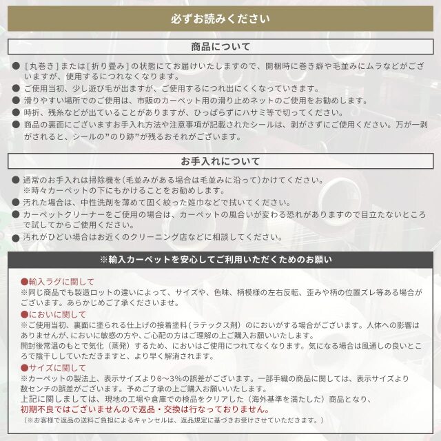 | 備考 | 丸洗い可能(洗濯ネットを使用し、手洗いコースをお選び下さい。洗濯機の取り扱い説明書をご確認の上、適した洗濯コースをお選びください。)洗濯後はすぐに形を整え日陰で干してください。乾燥機は使用できません。大きめサイズの洗濯に関しては、コインランドリー等をご使用ください。(190×190cm以上推奨)ご自宅の洗濯機容量が異なるため、お客様にてご確認ください。 / ※こちらの画像は円形140cmを使用しております。 / 床暖房の上敷き、ホットカーペットカバー対応 。 |