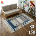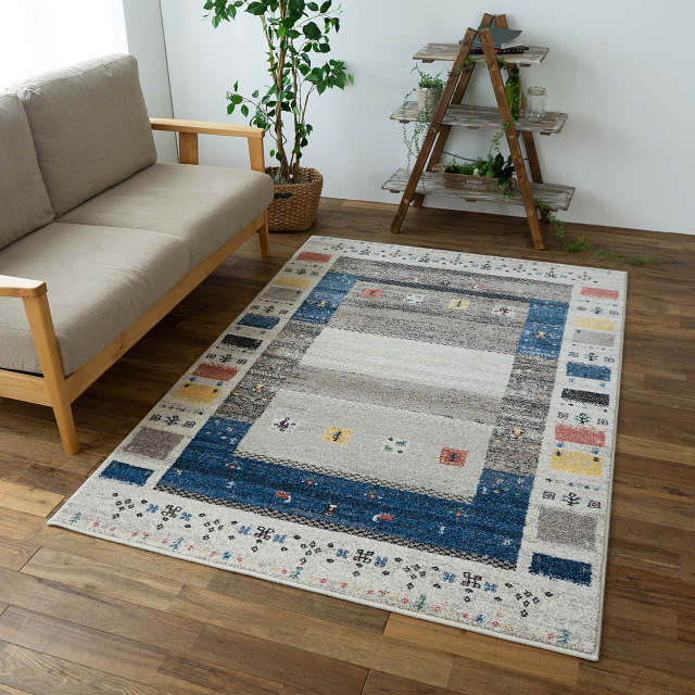 素朴でシンプルなギャッベ風のパネル調のデザインは、一つ一つが絨毯の柄となっており、たくさんの柄が合わさって1枚のデザインとなっております。エスニックな雰囲気でカジュアルなお部屋や、北欧風のシンプルな家具などにもお楽しみいただけます。