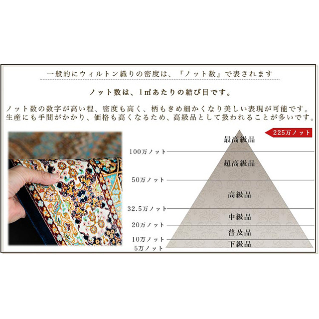 | お読みください | 【 商品について 】 ・[丸巻き]の状態でお届けいたします。開梱時に巻き癖(折り癖)や毛並みにムラなどがございますが、使用するにつれなくなります。 ・ご使用当初、少し遊び毛が出ますが、ご使用するにつれ出にくくなっていきます。 ・滑りやすい場所でのご使用は、市販のカーペット用の滑り止めネットのご使用をお勧めします。 ・時折、残糸などが出ていることがありますが、ひっぱらずにハサミ等で切ってください。 ・商品の裏面にございますお手入れ方法や注意事項が記載されたシールは、剥がさずにご使用ください。万が一剥がされると、シールの”のり跡”が残るおそれがございます。 【 お手入れについて 】 ・通常のお手入れは掃除機を(毛並みがある場合は毛並みに沿って)かけてください。 ※時々カーペットの下にもかけることをお勧めします。 ・汚れた場合は、中性洗剤を薄めて固く絞った雑巾などで拭いてください。 ・カーペットクリーナーをご使用の場合は、カーペットの風合いが変わる恐れがありますので目立たないところで試してからご使用ください。 ・汚れがひどい場合はお近くのクリーニング店などに相談してください。 【 輸入カーペットを安心してご利用いただくためのお願い 】 下記に関しましては、商品の初期不良ではございませんので返品・交換は行なっておりません。 (※お客様で返品の送料ご負担によるキャンセルは、返品規定に基づきお受けさせていただきます。) ・ご使用当初、裏面に塗られる仕上げの接着塗料(ラテックス剤)のにおいがする場合がございます。 人体への影響はありませんが、においに敏感の方や、ご心配の方はご理解の上ご購入お願いいたします。 開封後常温のもとで気化(蒸発)するため、においはご使用につれてなくなります。気になる場合は風通しの良いところで陰干ししていただきますと、より早く解消されます。 ・カーペットの製法上、表示サイズより0~3%の誤差がございます。 ※カラーはディスプレイ上、実際の色と多少異なる場合がございます。 |