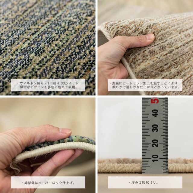 | 組成 | ポリプロピレン100%(ヒートセット加工あり) / ウィルトン織り・1?辺り300,000ノット |